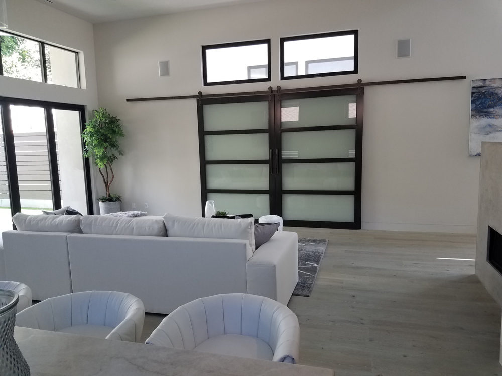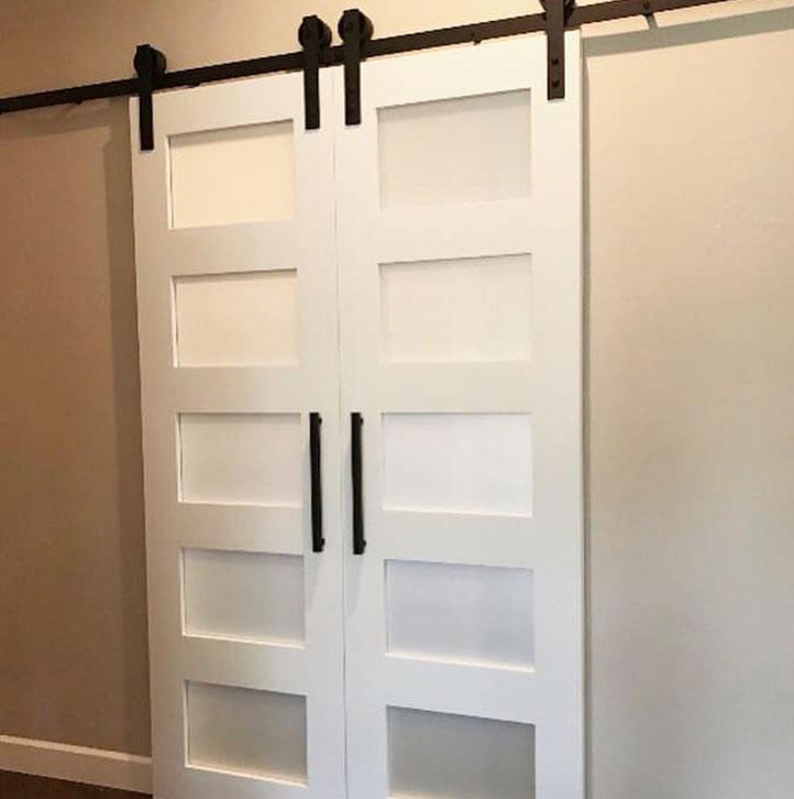 Barn doors are great for giving your home a rustic look while saving interior space, similar to a pocket door. Interior barn doors are hung from a track mounted on the wall above a door opening. It works best for a living room or can be equally appropriate for a closet and laundry room door.